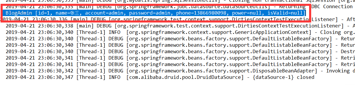 public class DemoTest extends BaseTest {@Autowiredprivate AdminDao adminDao;@Testpublic void selectAdminById(){BlogAdmin admin =adminDao.selectAdminById(1);System.out.println(admin);}}