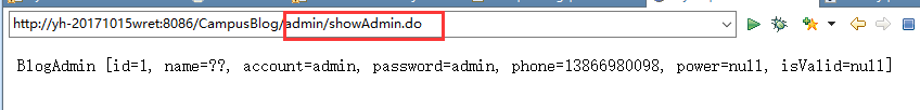 public class AdminController {@Resource private BlogAdminService adminService;@RequestMapping("/showAdmin")public BlogAdmin find(HttpServletResponse response)throws Exception{BlogAdmin admin=adminService.getAdminById(1);JSONObject jsonObject=JSONObject.fromObject(admin);PrintWriter out=response.getWriter();out.println(admin.toString());out.flush();out.close();return null;}}