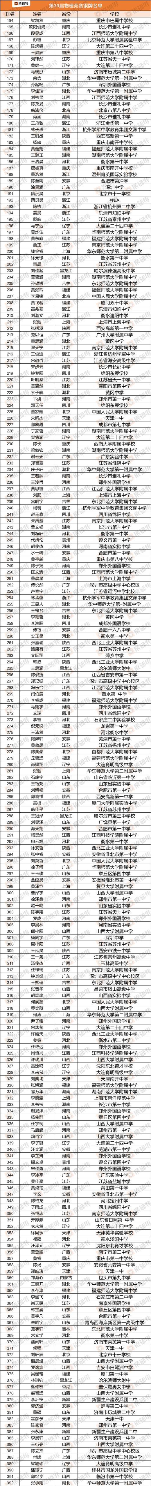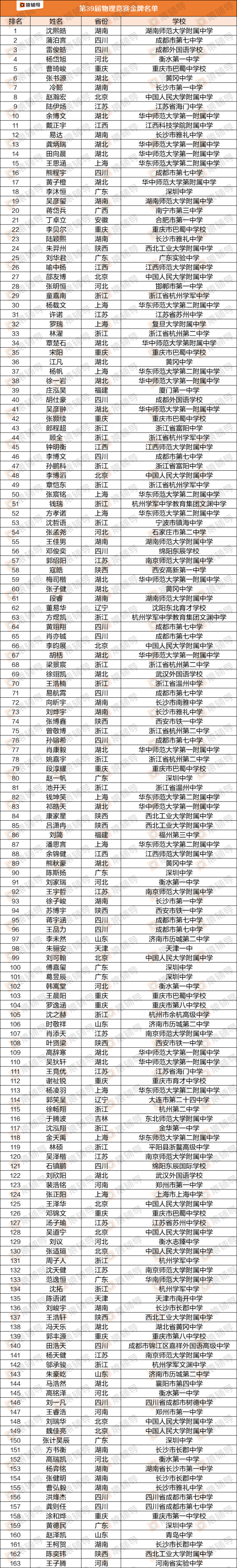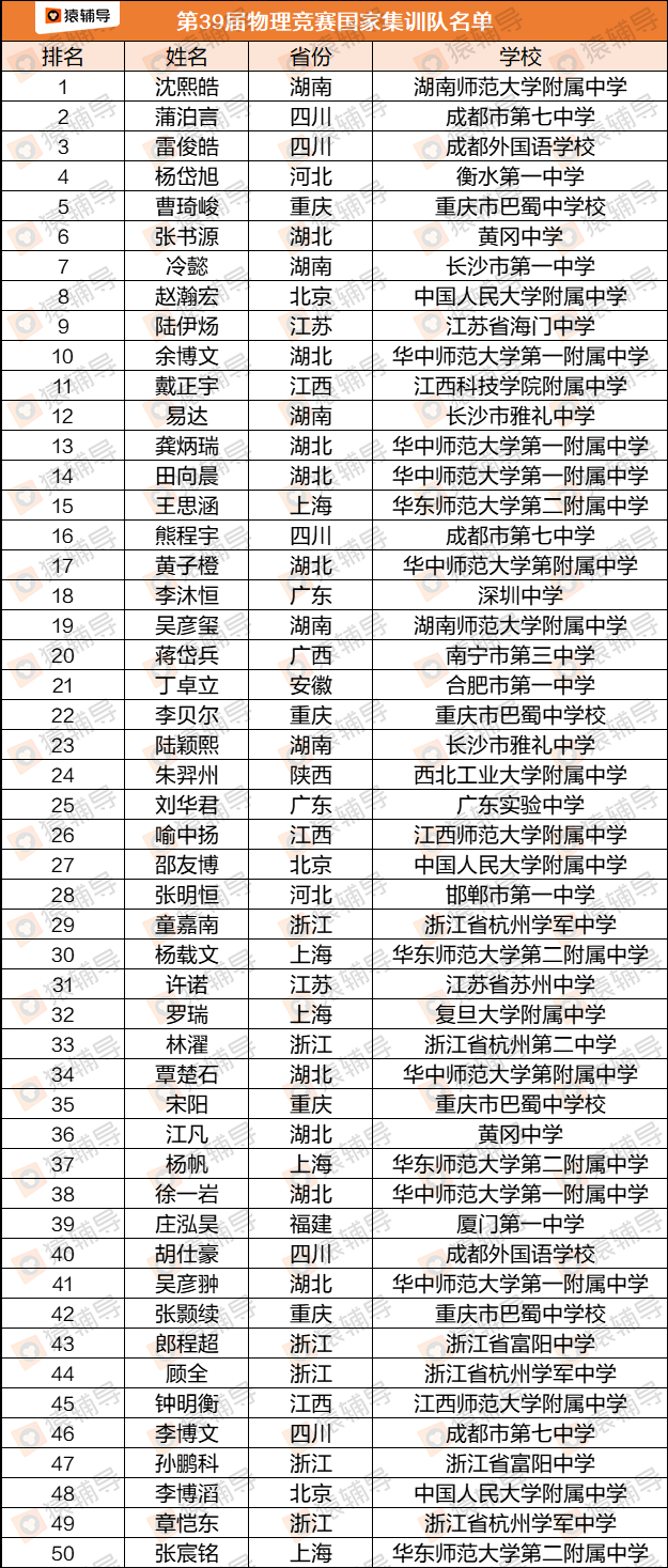国家集训队50人分别来自15个省市。其中,湖北集训队人数最高,共9人;浙江国集6人,位居第二,湖南、四川、上海国集各5人,并列第三。全国第一来自湖南师大附中的沈熙皓同学(总成绩第一、理论成绩第一),实验成绩第一来自江西师范大学附属中学的余锦健,女生总分第一来自长沙雅礼中学的陆颖熙同学。
