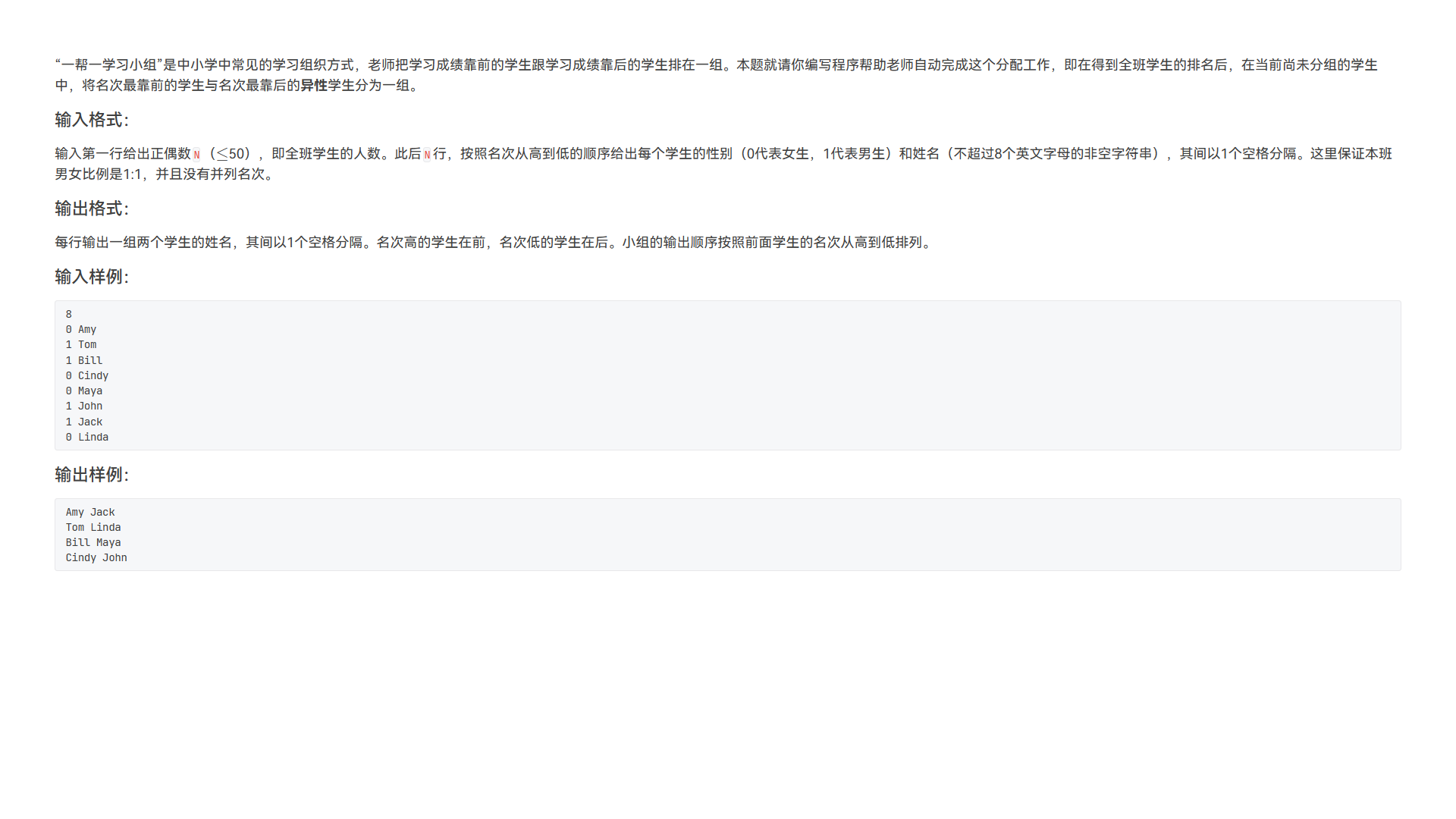 “一帮一学习小组”是中小学中常见的学习组织方式,老师把学习成绩靠前的学生跟学习成绩靠后的学生排在一组。本题就请你编写程序帮助老师自动完成这个分配工作,即在得到全班学生的排名后,在当前尚未分组的学生中,将名次最靠前的学生与名次最靠后的异性学生分为一组。