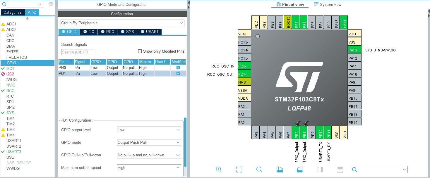 2.设置GPIO口, GPIOB PIN_0 为低电平,PIN_1为低电平