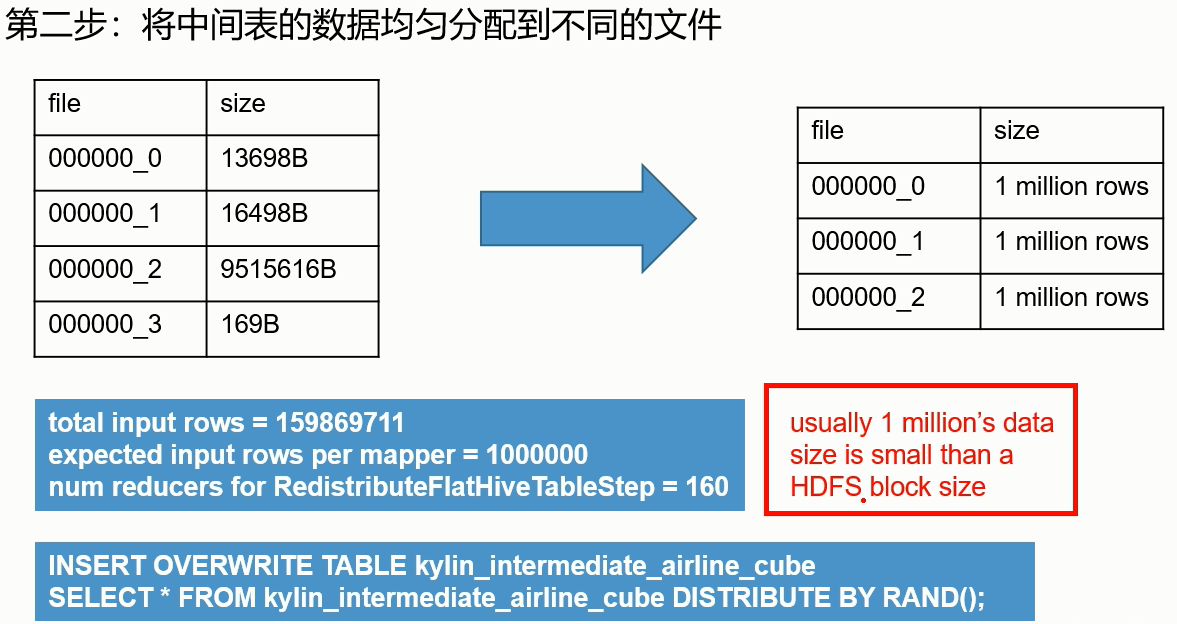 我们来看看kylin到底是怎么均匀分配的。首先它会计算表中总共有多少行数据(total input rows),然后它默认每个文件1000000行数据(一百万行数据差不多不会超过hdfs一个块大小,也就是128M),然后计算有多少个文件(多少个reduce),total input rows/1000000。我们这里只有1个文件。然后设定reduce任务的个数,用distribute by重新将这些数据分配到不同的文件中。