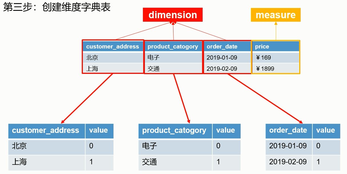 比如job,可能有很多值,去重后,每个值按照0到N,一一映射保存到各个维度表中,这样做便于以后查询效率高,下面你就能感受到这种设计的巧妙之处了。