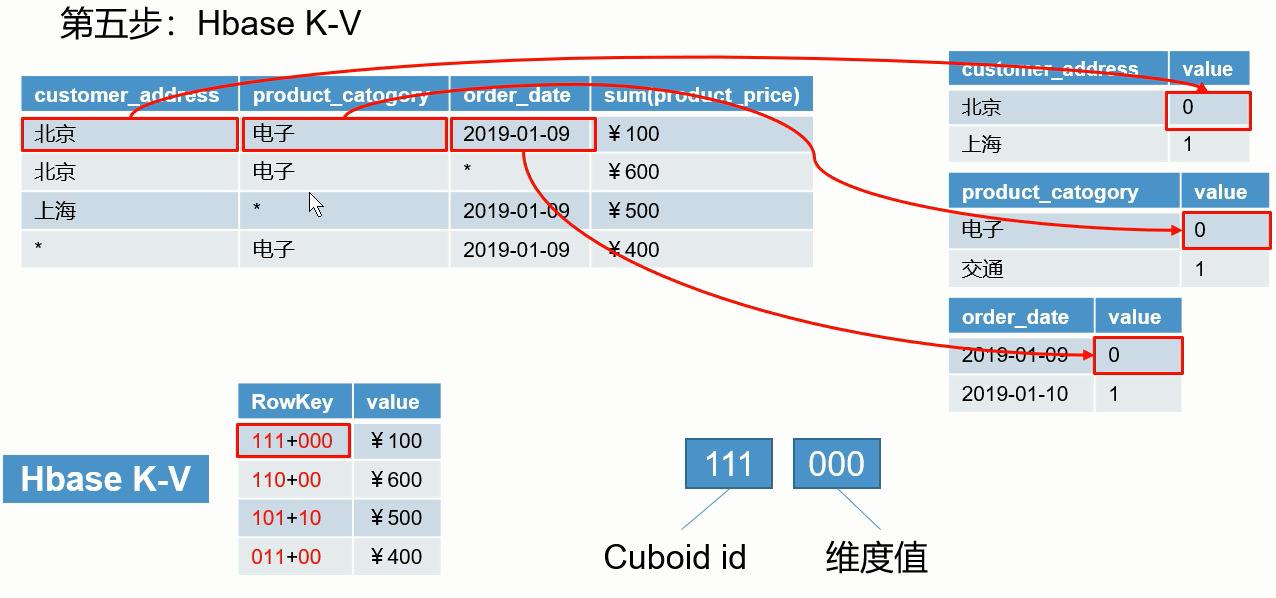 按照步骤3,4一一构建映射。rowkey是由维度id+维度值组成的。比如第一行 java,2019-10-01,partA,10000这条数据,每一维都有数据,所以每一维都记1,就是111,然后对照步骤3,维度值是000,结果就是111000。再举个例子,比如第二行,c++ ,2019-05-01, * , 30000。只有前面两维有数据,所以是110,对照步骤3,维度值就是11,结果就是11011(注意,维度值是0就省略掉)。最终步骤4构建如下所示。(为了方便大家看,rowkey中写了‘+’,其实是没有‘+’)现在看看,数据全部都是数字存储,是不是简便了很多了。等会查询的时候你也会发现查询的效率也很高。