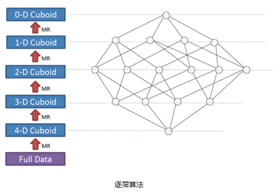 我们知道,一个N维的Cube,是由1个N维子立方体、N个(N-1)维子立方体、N*(N-1)/2个(N-2)维子立方体、......、N个1维子立方体和1个0维子立方体构成,总共有2^N个子立方体组成,在逐层算法中,按维度数逐层减少来计算,每个层级的计算(除了第一层,它是从原始数据聚合而来),是基于它上一层级的结果来计算的。比如,[Group by A, B]的结果,可以基于[Group by A, B, C]的结果,通过去掉C后聚合得来的;这样可以减少重复计算;当 0维度Cuboid计算出来的时候,整个Cube的计算也就完成了。