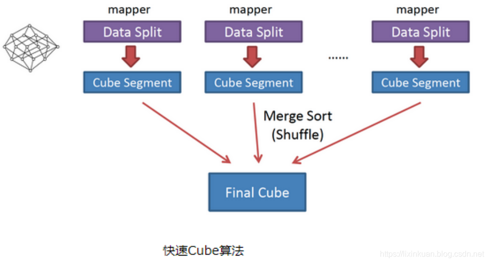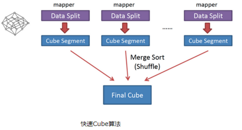 也被称作“逐段”(By Segment) 或“逐块”(By Split) 算法,从1.5.x开始引入该算法,该算法的主要思想是,每个Mapper将其所分配到的数据块,计算成一个完整的小Cube 段(包含所有Cuboid)。每个Mapper将计算完的Cube段输出给Reducer做合并,生成大Cube,也就是最终结果。如图所示解释了此流程。