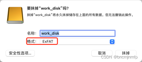 格式选择ExFAT即可开始抹掉,注意抹掉会删除硬盘里原来的文件,所以要注意备份。
