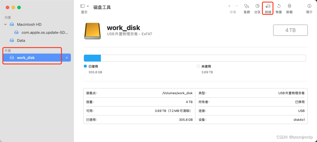 打开磁盘工具,在外置硬盘中找到相应的硬盘,选择“抹掉”