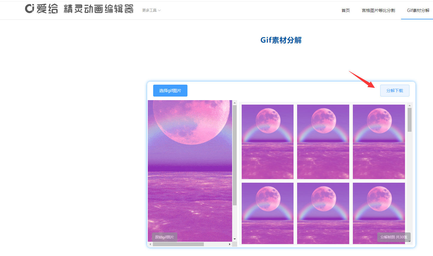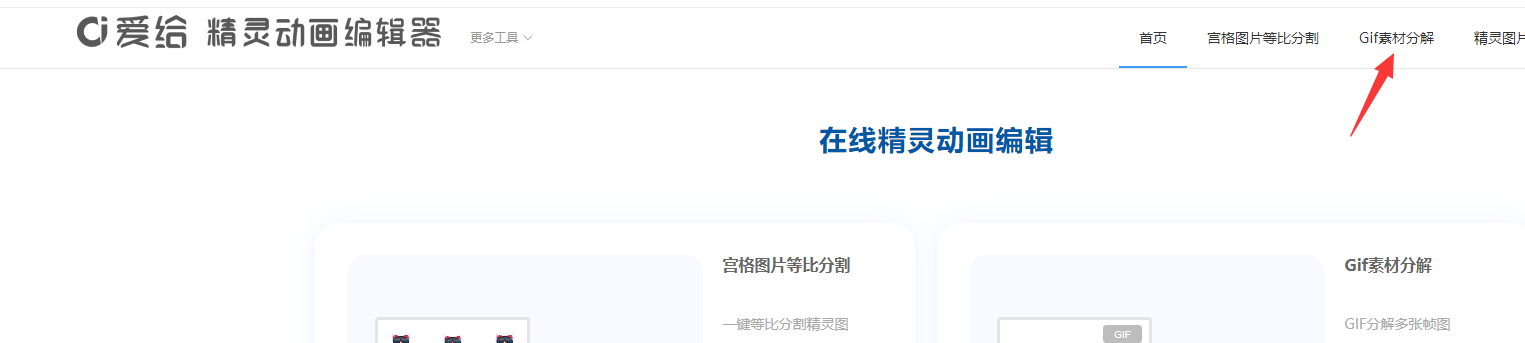 二、打开爱给精灵动画编辑器,找到GIF素材分解;