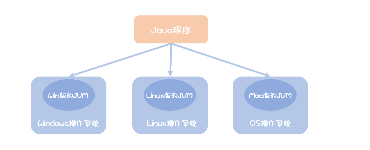 Java程序是不变的,不同平台的JVM对Java语言进行了翻译。就像是我只会说汉语,我去了日本我找个会日语的翻译,去了美国找个会英语的翻译。我只管用汉语(Java)去表达我的意思,让翻译(JVM)来转换成对应语言即可。