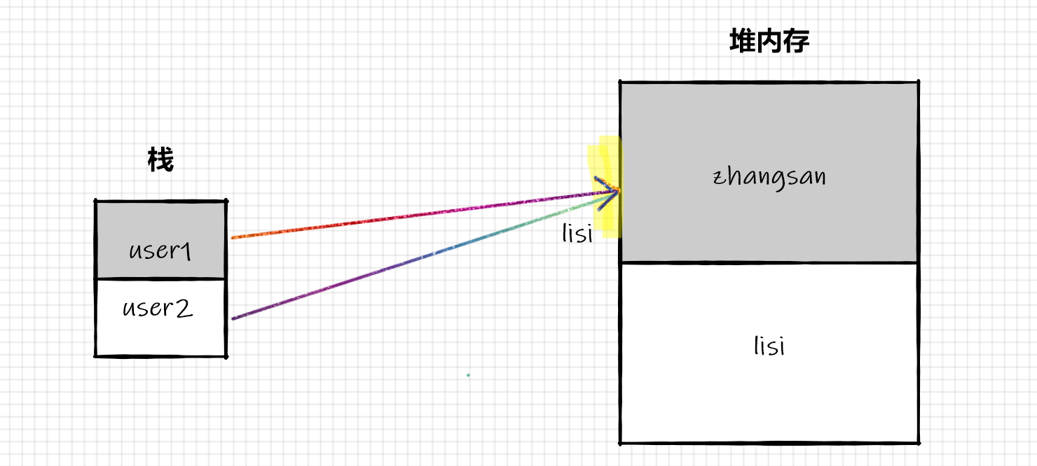 原因就是user2 = user1; user2也指向了user1指向的堆内存地址