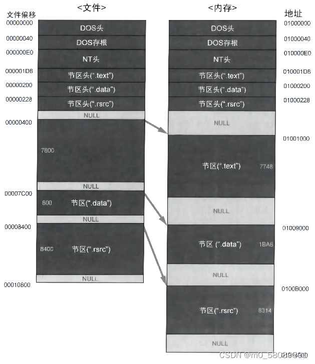 文件偏移地址(Offset):当PE文件存储在磁盘中时,某个数据的位置相对于文件头的偏移量称为文件偏移地址(File Offset)。文件偏移地址从PE文件的第一个字节开始计数,起始值为0