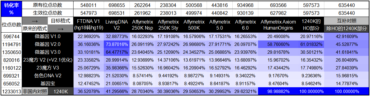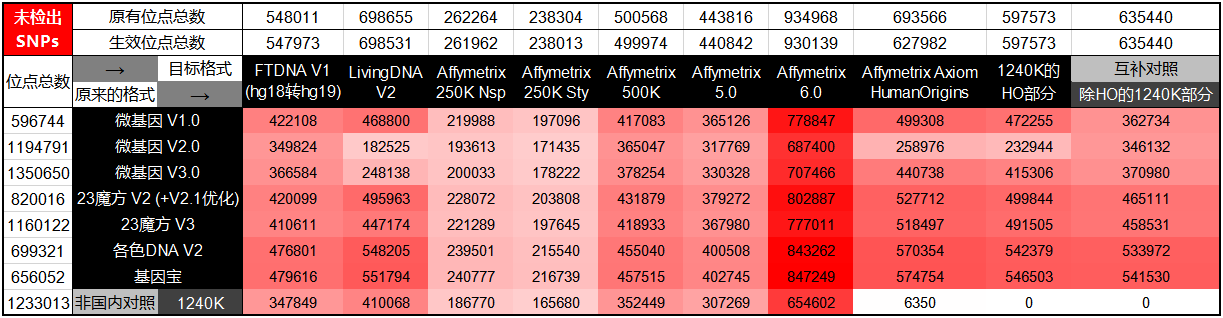 从整体来看,国内格式转化到 Affymetrix 格式的转化率都不理想,仅微基因2.0版对 Affymetrix Human Origins 位点集相对兼容些(同时微基因2.0也更兼容 Illlumina GSA 位点集)。如果您需要用到自己数据的 Affymetrix 官方格式,本人建议使用从全基因组数据的 BAM 或 CRAM 文件提取到芯片格式的方法。