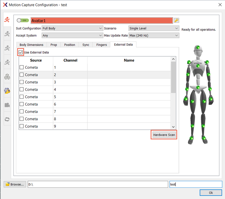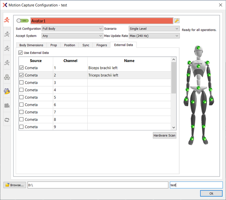 4 - 在动作捕捉配置窗口中,将找到一个标有“外部数据”的选项卡。选中标有“使用外部数据”的框,能够看到连接到MVN软件的任何EMG系统。