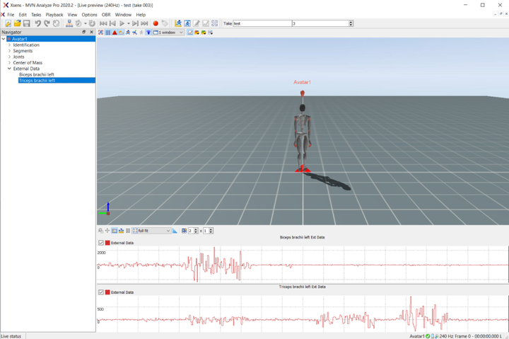 7 - 肌电图数据将显示在“外部数据”选项卡中。在开始记录之前,通过在 MVN 中打开图形并拖放 EMG 信号来验证您是否在软件中接收到肌电图信号。