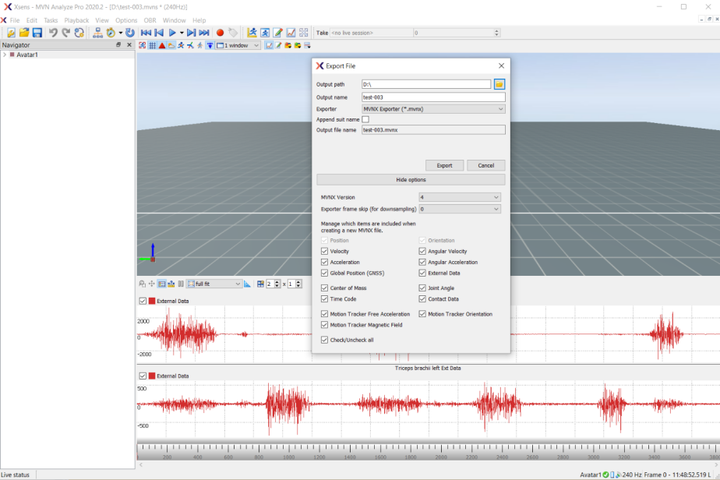 可以以 mvnx 和 excel 格式导出数据。从 MVN 2021.2 开始,也可以以 C3D 格式导出数据。在C3D文件中,EMG数据将作为模拟数据列出。