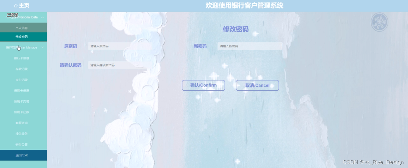 用户使用该银行客户管理系统注册完成后,用户对登录密码有修改需求时,系统也可以提供用户修改密码权限。系统中所有的操作者能够变更自己的密码信息,执行该功能首先必须要登入系统,然后选择密码变更选项以后在给定的文本框中填写初始密码和新密码来完成修改密码的操作。在填写的时候,假如两次密码填写存在差异,那么此次密码变更操作失败,下面的图片展示的就是该板块对应的工作面。
