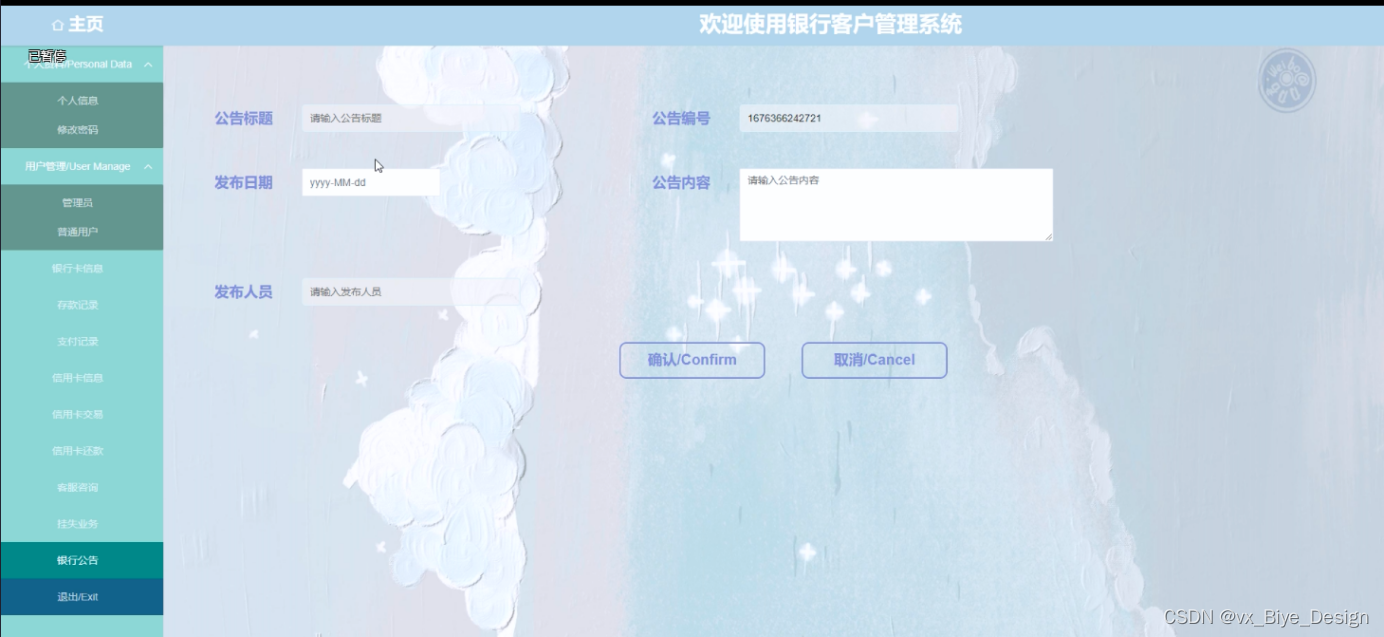 在主页左侧菜单栏中点击“银行公告”按钮,再从二级目录中点击“新增公告”按钮,进入到新增公告界面。在此处公告可以添加公告的标题、编号、内容。