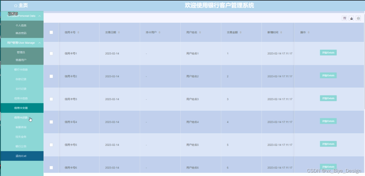 (5)信用卡信息:用户点击“信用卡信息”会显示出所有的信用卡信息,支持输入信用卡号或者办卡日期对信用卡信息进行查询,如果想要添加新的信用卡信息,点击“添加”按钮,输入相关信息,点击“提交”按钮就可以添加了,同时可以选择某一条信用卡信息,点击“删除”进行删除,也可以点击后面的“交易”、“还款”按钮对信用卡信息的交易/还款信息进行更新维护;