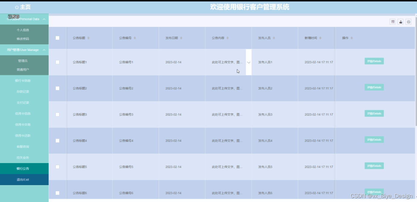 (7)银行公告:点击“银行公告”这个菜单,可以查看到系统中所有添加的银行公告信息,支持通过公告标题或者公告编号对银行公告信息进行查询,如果想要了解某一银行公告的详细信息,点击后面的“详情”会进入详情界面;