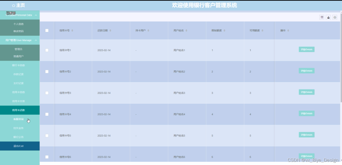 通过编写银行客户管理系统的测试用例,已经检测完毕用户的登录模块、信用卡还款信息添加模块、查询信用卡信息模块、信用卡交易添加模块的功能测试,在对以上功能得测试过程中,发现了系统中的很多漏送并进行了完善,经过多人在线进行测试,系统完全可以正常运行,当然在后期的维护中系统将不断完善。