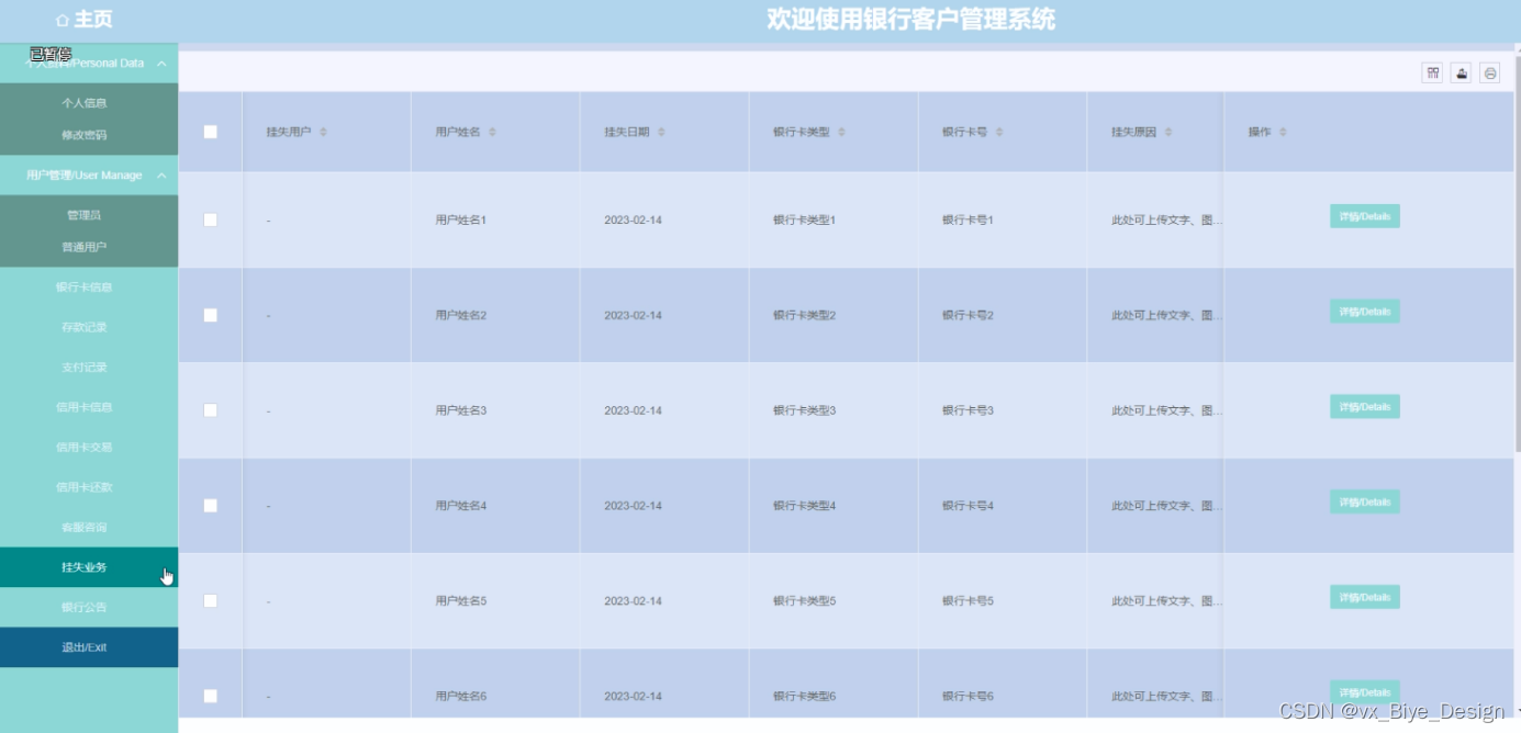 用户选择挂失业务添加记录,管理员审核挂失业务信息,管理所有用户的挂失业务记录。