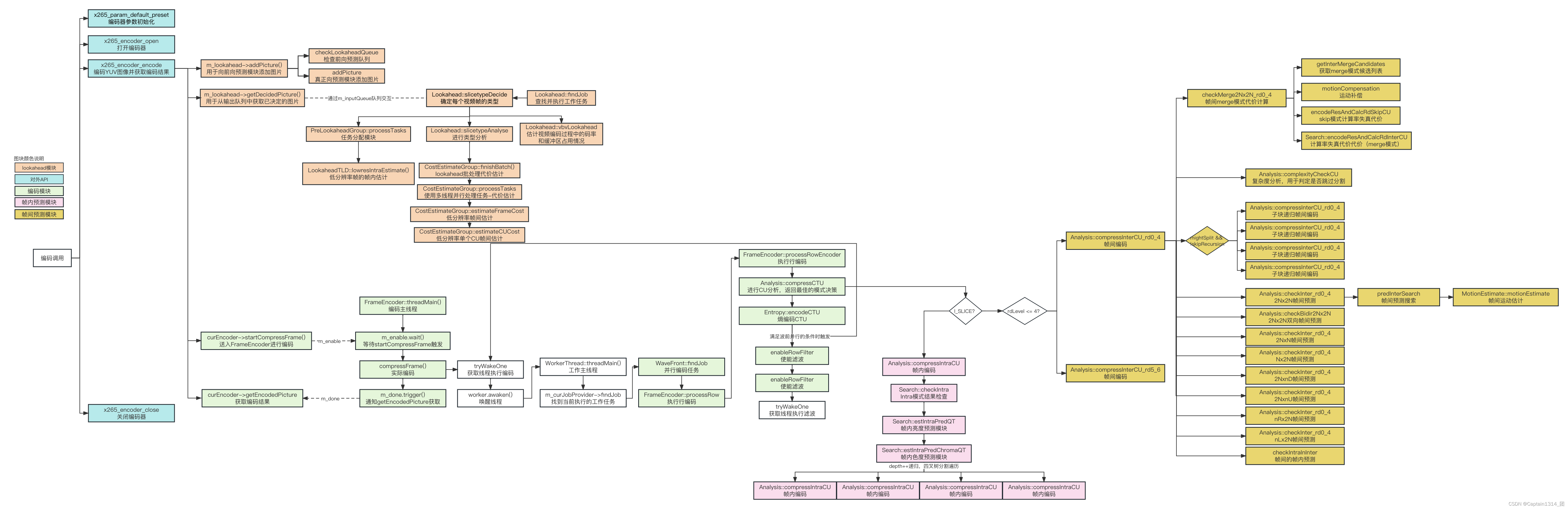 帧间预测流程总体流程如下图,黄色部分即为帧间预测流程的过程,下面流程图也包含了x265其他模块的流程。