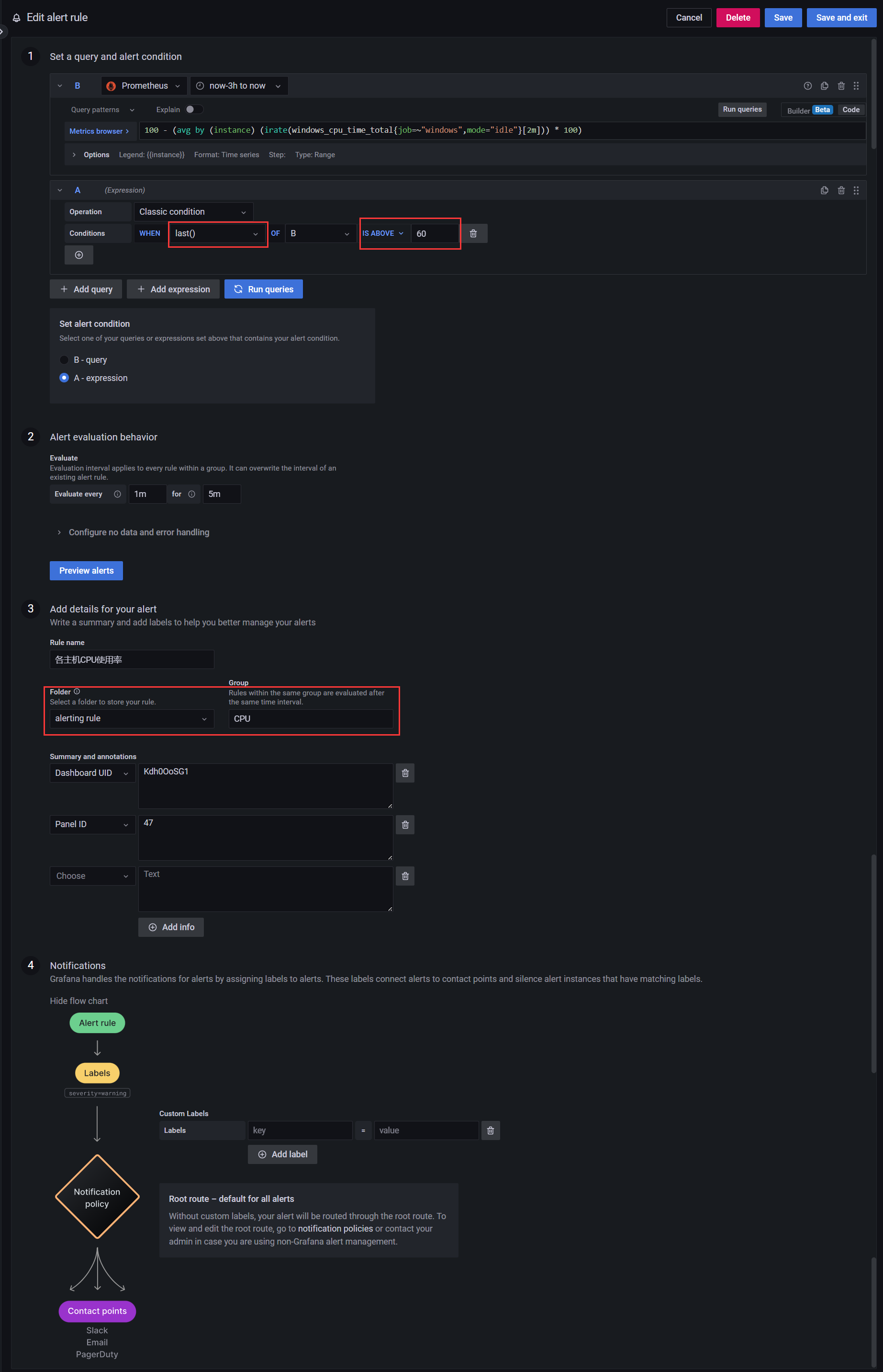 1. 上图第一步中的A (Expression)中的Conditions的第一项last() 表示最新数据,还有很多其他选项如max() 表示最大值,一般我们选择last(),第三项则标识我们要监控的值达到多少触发,触发判断是前面的选项如图中的IS ABOVE则表示在这之上,还有其他几个选项如在这之下、超出范围、在范围内、无值。此处我们选择IS ABOVE,表达式综合就是:当CPU使用率超过60则触发。