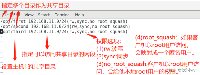/etc/exports //配置的是共享目录,客户机地址(权限选项)