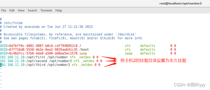 2.进入/etc/fstab文件中,将主机2的挂载目录设置为永久挂载