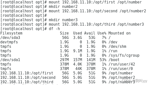 10.主机2新建三个目录,将主机1共享出来的目录挂载到主机2的指定目录下,再查看挂载情况