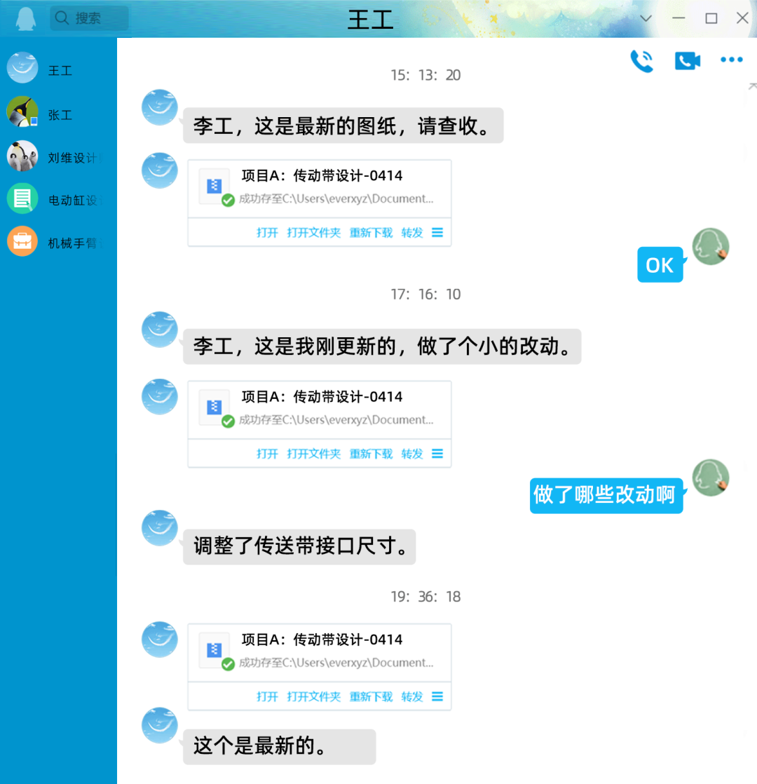 由于公司规模不大,目前没有上任何类似PDM的管理系统,公司内部的信息交流全靠QQ/微信/邮件这种即时通讯软件,项目图纸也是用一台电脑的公共盘进行管理。李工就是靠这些工具,每天一遍遍询问项目成员进展,并且要求团队成员及时发送最新图纸汇总管理项目进度的。