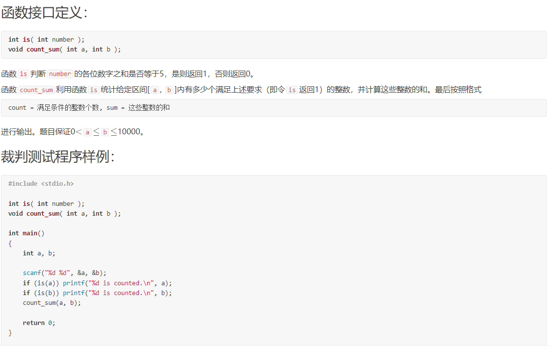 /* if(number/100+number%100/10+number%10==5) 这里的这个条件是用于三位数,而题目给的数字大小范围是0-999,小编这里没看题目出于习惯吃了个哑巴亏*/int a,s=0; while(number>0)//循环条件 {a=number%10;//将数取余分离 s=a+s;number=number/10;//通过除以10进入下一个循环的计算,疑惑的小伙伴可以拿起笔动手算一算这个循环 }if(s==5)return 1; else return 0;