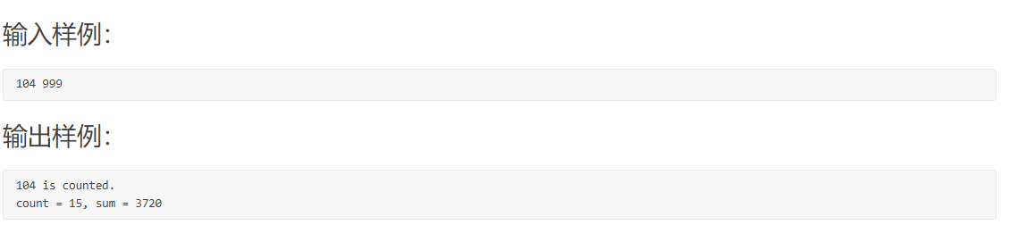 {int i,t=0,k=0;for(i=a;i<=b;i++){if(is(i)){k++;t+=i; }}printf("count = %d, sum = %d",k,t);