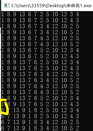 }void dfs(int s) {if (s == 12) {if (judge()) {cnt++;for (int i = 1; i <= 12; i++) {cout << a[i] << " ";}cout << endl;}return ;}for (int i = 1; i <= 13; i++) {if (!v[i]) {a[p++] = i;v[i] = 1;dfs(s + 1);v[i] = 0;p--;}}