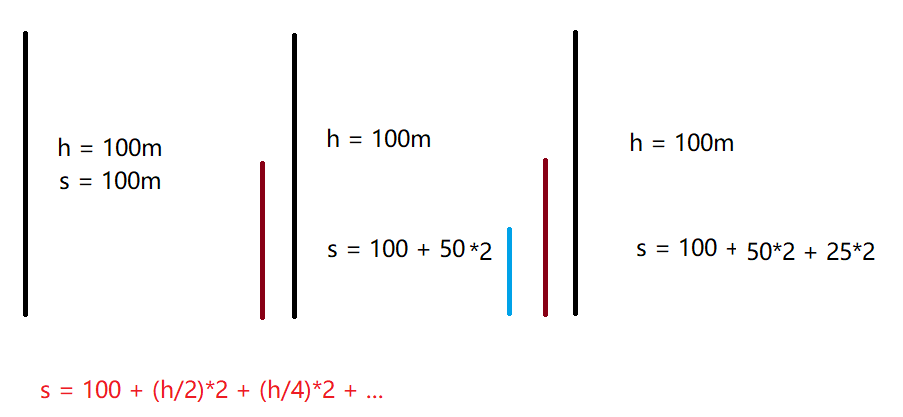 public class Day06 {public static void main(String[] args) {double s = 100;//总距离double h = 100;//第一次高度int n = 10;double d = 0;//每次落地之间间隔的距离for(int i = 1;i <= n;i++) {s += d;h/= 2.0;d = h*2;}System.out.println("共走过:" + s + "米");System.out.println("第" + n + "次反弹的高度是:" + h);}
