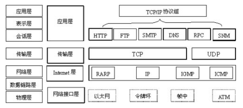 从下面这张图可以看出TCP/IP协议簇中不同的层次中有着很多不同的网络协议,下面主要介绍传输层的TCP、UDP协议和应用层的HTTP协议。