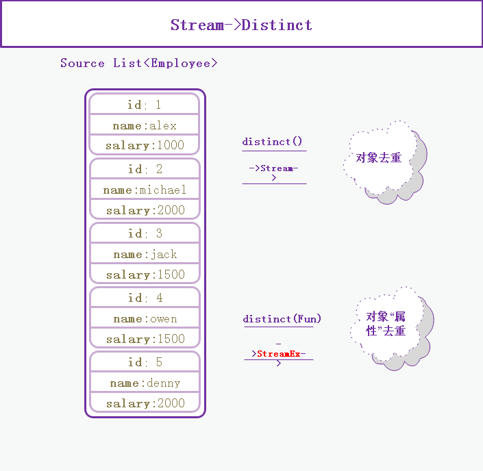 public class EmployeeTestCase extends BaseTest{@Testpublic void distinct() {//常规实现方式List employeesDis = list.stream().distinct().collect(Collectors.toList());assertEquals(employeesDis.size(),5);//StreamEx 实现方式List employeesDisBySalary2 = StreamEx.of(list).distinct(Employee::getSalary).peek(System.out::println).collect(Collectors.toList());//Stream filter 实现方式List employeesDisBySalary = list.stream().filter(distinctByKey(Employee::getSalary)).collect(Collectors.toList());assertEquals(employeesDisBySalary,employeesDisBySalary2);}private static Predicate distinctByKey(Function super T, ?> keyExtractor) {Map
