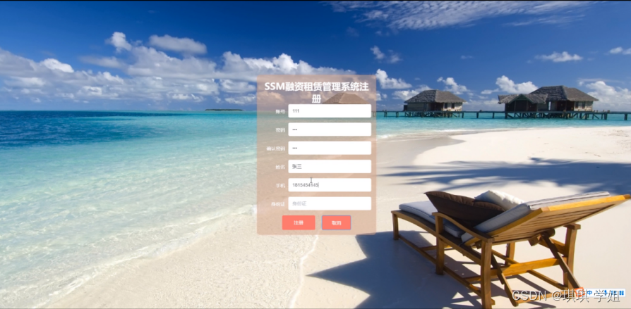 用户注册,在用户注册页面通过填写账号,密码,确认密码,姓名,手机,身份证等内容进行注册操作,如图5-2所示。
