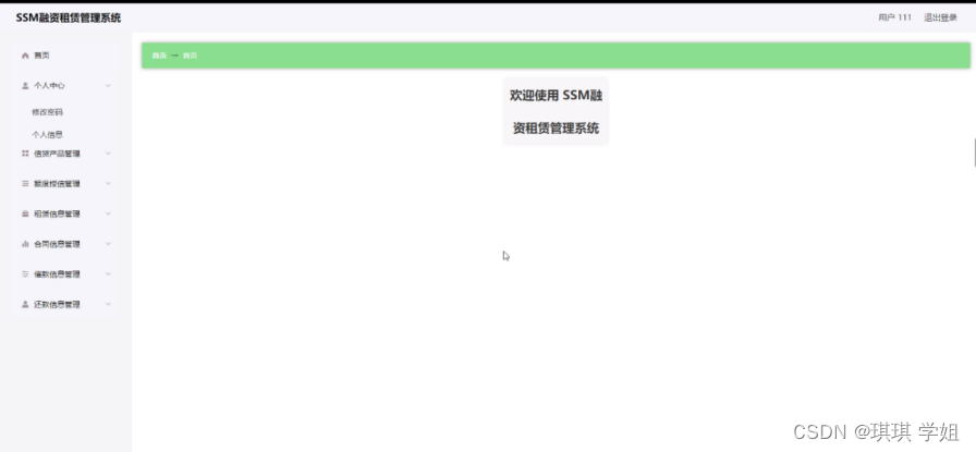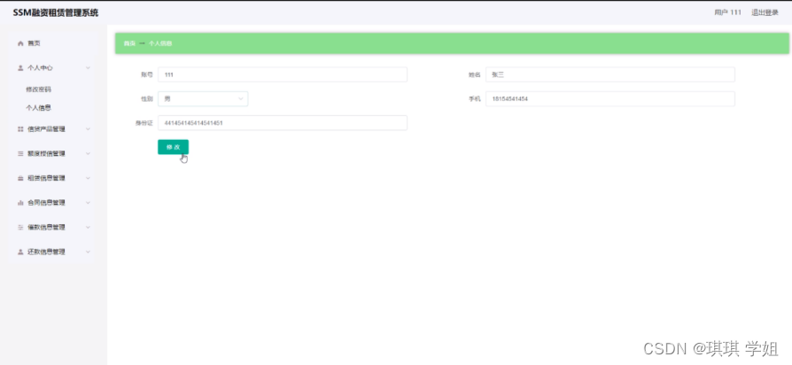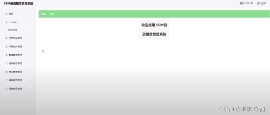 用户登录进入融资租赁管理系统可以查看首页,个人中心,信贷产品管理,额度授信管理,租赁信息管理,合同信息管理,催款信息管理,还款信息管理等内容进行详细操作,如图5-14所示。