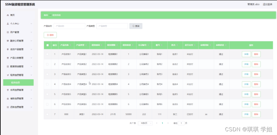 租赁信息管理,在租赁信息管理页面可以对索引,产品名称,产品类型,租赁时间,租赁期限,租赁价款,公司编号,账号,姓名,是否支付,审核回复,审核状态等内容进行详情或删除等操作,如图5-9所示。