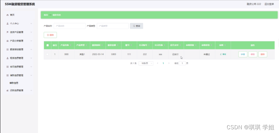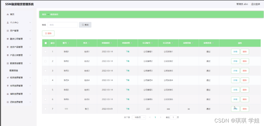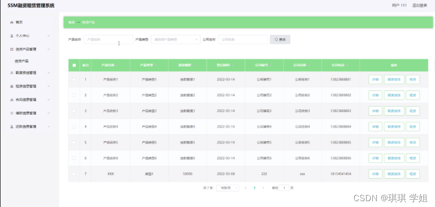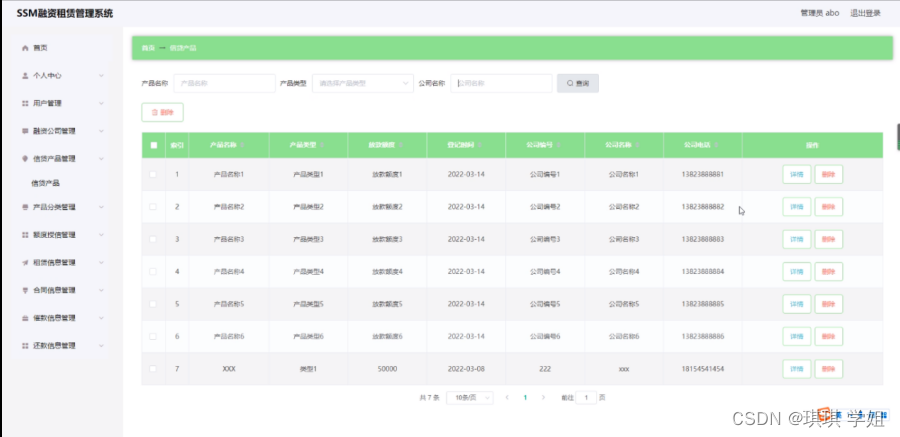 信贷产品管理,在信贷产品管理页面可以对索引,产品名称,产品类型,放款额度,登记时间,公司编号,公司名称,公司电话等内容进行详情或删除等操作,如图5-7所示。