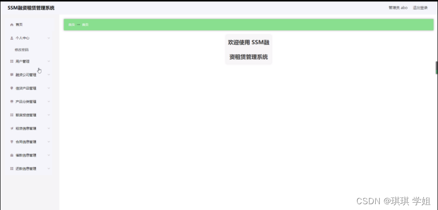 管理员登录进入融资租赁管理系统可以查看首页,个人中心,用户管理,融资公司管理,信贷产品管理,产品分类管理,额度授信管理,租赁信息管理,合同信息管理,催款信息管理,还款信息管理等内容进行详细操作,如图5-4所示。