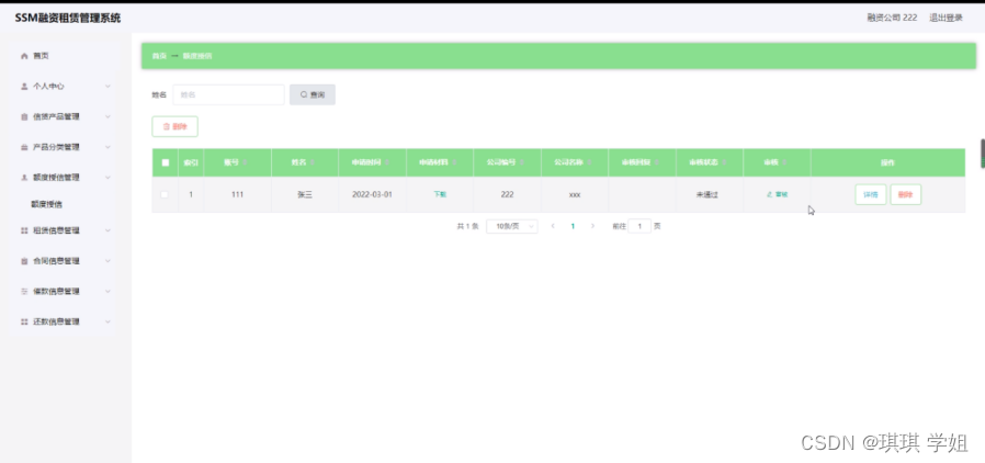 额度授信管理,在额度授信管理页面可以对索引,账号,姓名,申请时间,申请材料,公司编号,公司名称,审核回复,审核状态等内容进行详情和删除等操作,如图5-8所示。