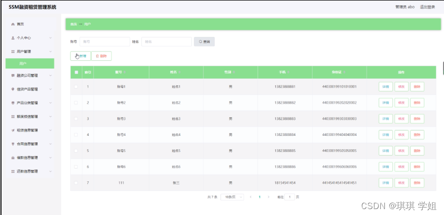 用户管理,在用户管理页面可以对索引,账号,姓名,性别,手机,身份证等内容进行详情,修改或删除等操作,如图5-5所示。