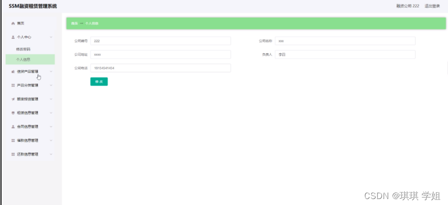 个人中心,在个人信息页面通过填写公司编号,公司名称,公司地址,负责人,公司电话等内容进行个人信息修改操作,如图5-11所示。