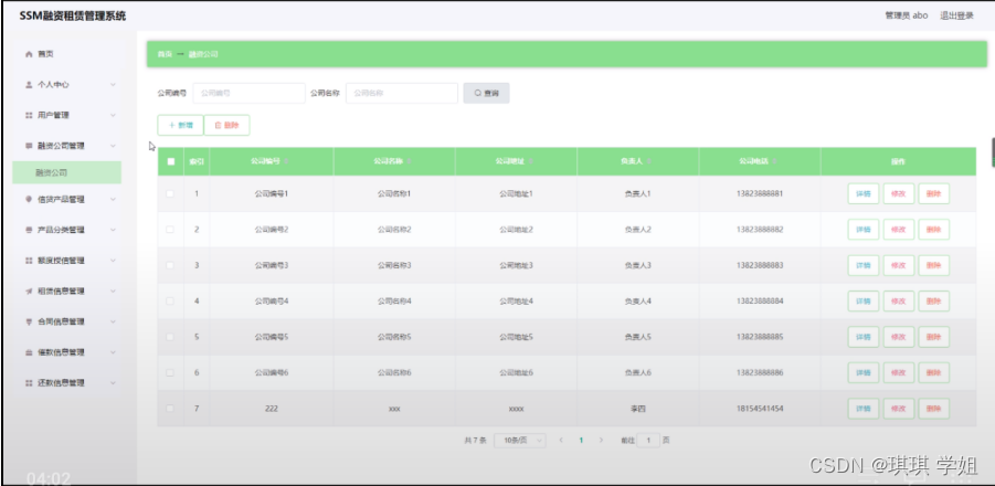 融资公司管理,在融资公司管理页面可以对索引,公司编号,公司名称,公司地址,负责人,公司电话等内容进行详情、修改或删除等操作,如图5-6所示。