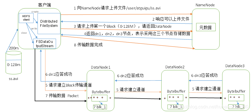 1)客户端通过Distributed FileSystem模块向NameNode请求上传文件,NameNode检查目标文件是否已存在,父目录是否存在。