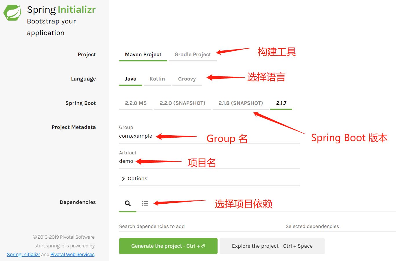 Spring Boot 版本我们选择最新稳定版,也就是 2.1.7 版。