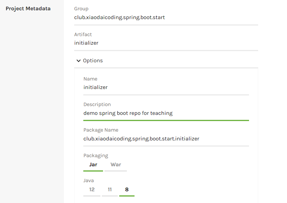 这个 Group 名首先表示它是隶属于 club.xiaodaicoding 下, 表示归我所有, spring 表示项目归为 Spring 这个大类中, 接下来是 boot, 表示是 Spring Boot 的内容, start 表示这个章节,而 initializer 是这节的内容,构建应用。